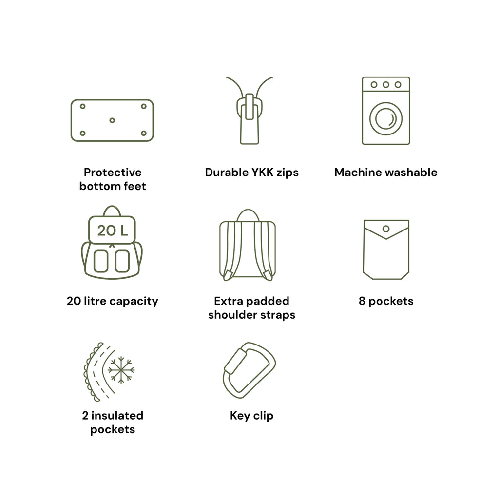 It includes four bonus accessories, eight pockets (including insulated bottle pockets), and a spacious 20L capacity for effortless organisation.