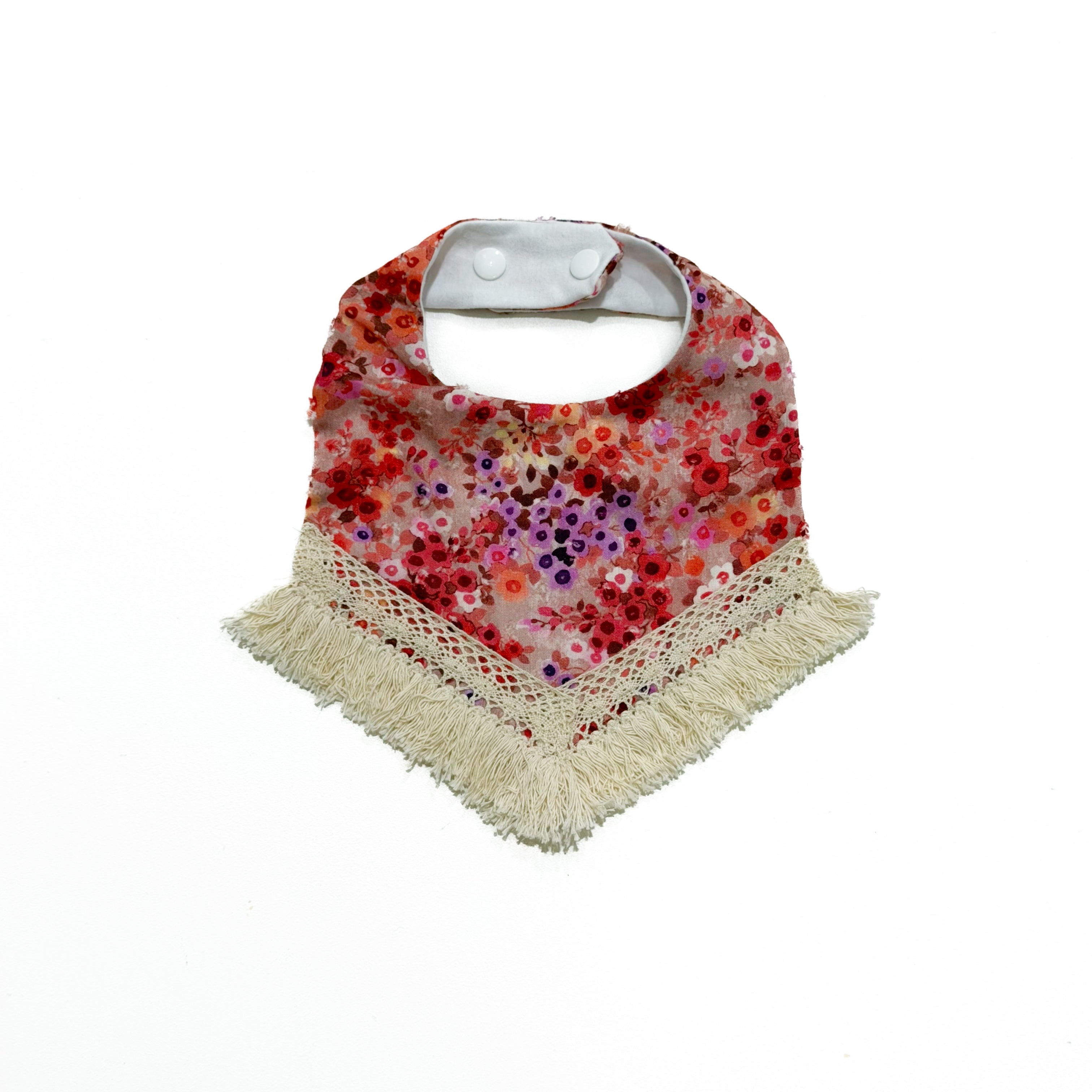 Our handmade Boho Bibs are made with stunning core Growbabyco fabrics, then lined with a light and absorbent cotton jersey lining. Each bib is trimmed with gorgeous cotton lace tassels and has 2 snap clips for easy sizing options.