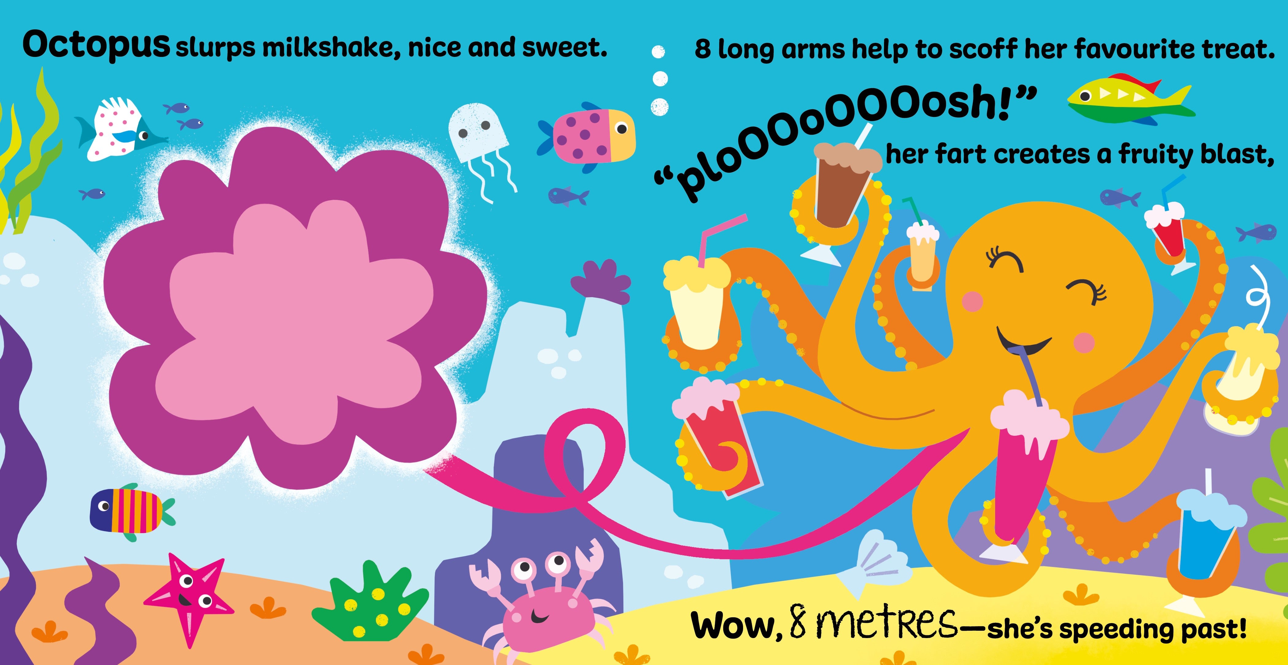 Each spread has a large flap to lift, then you scratch 'n' sniff the surface to reveal smell, what's your favourite bottom burp smell?