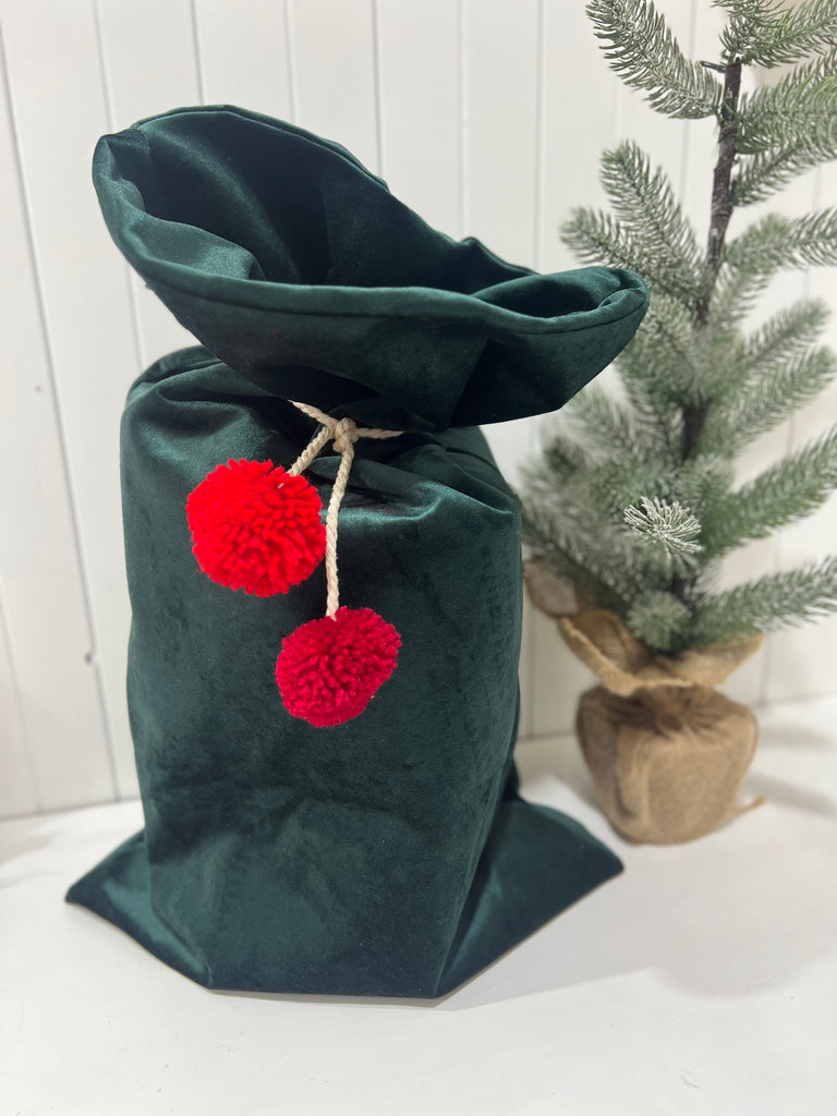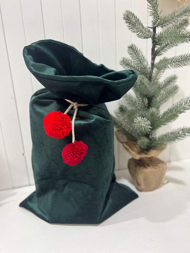 Santa Sack Luscious Velvet with Pom Poms - EMERALD GREEN