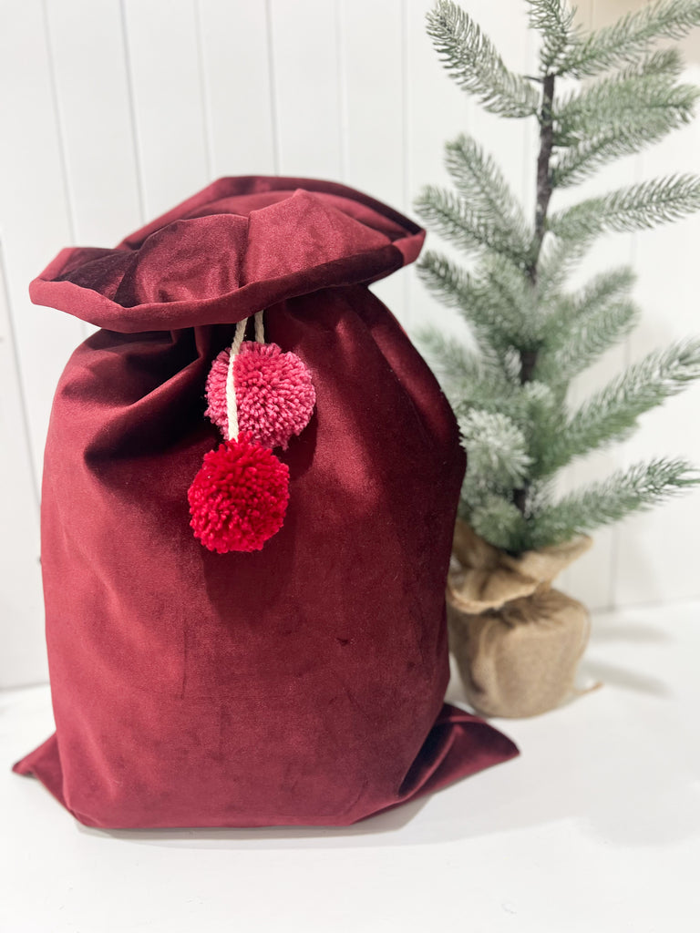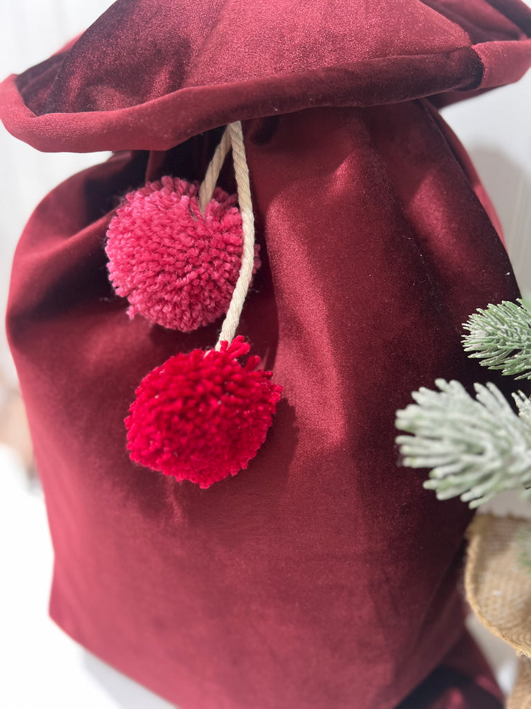 Santa Sack Luscious Velvet with Pom Poms - RED