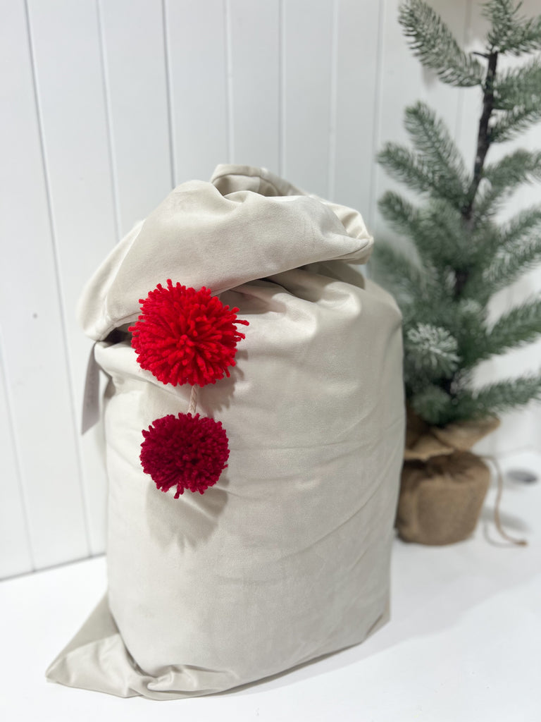 Santa Sack Luscious Velvet with Pom Poms - IVORY
