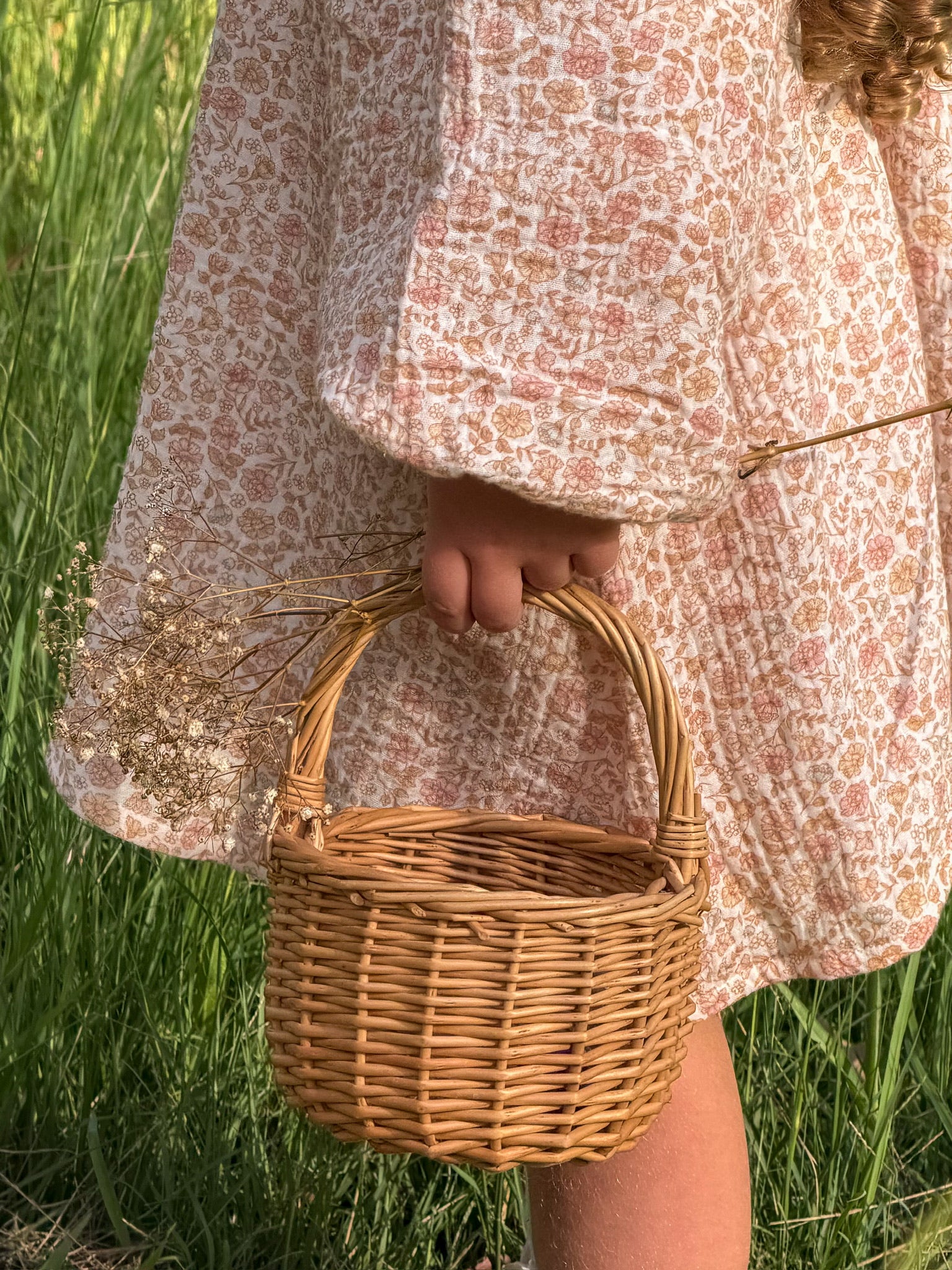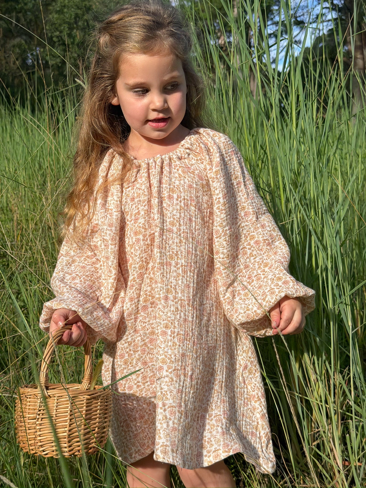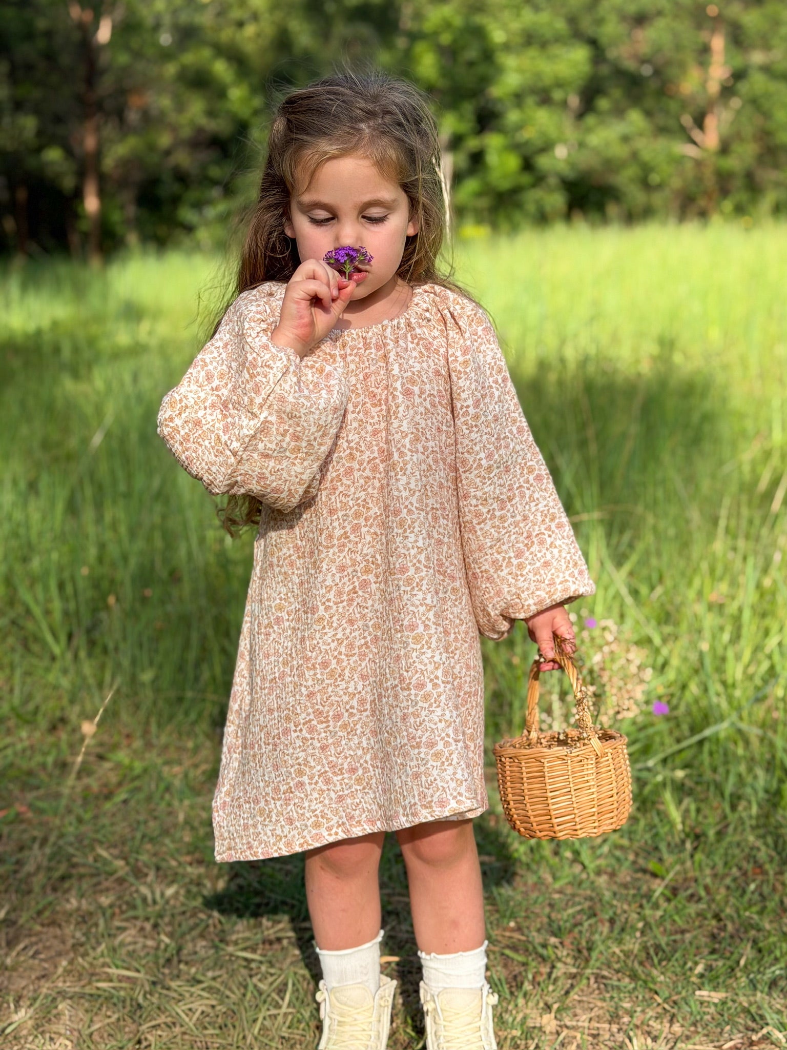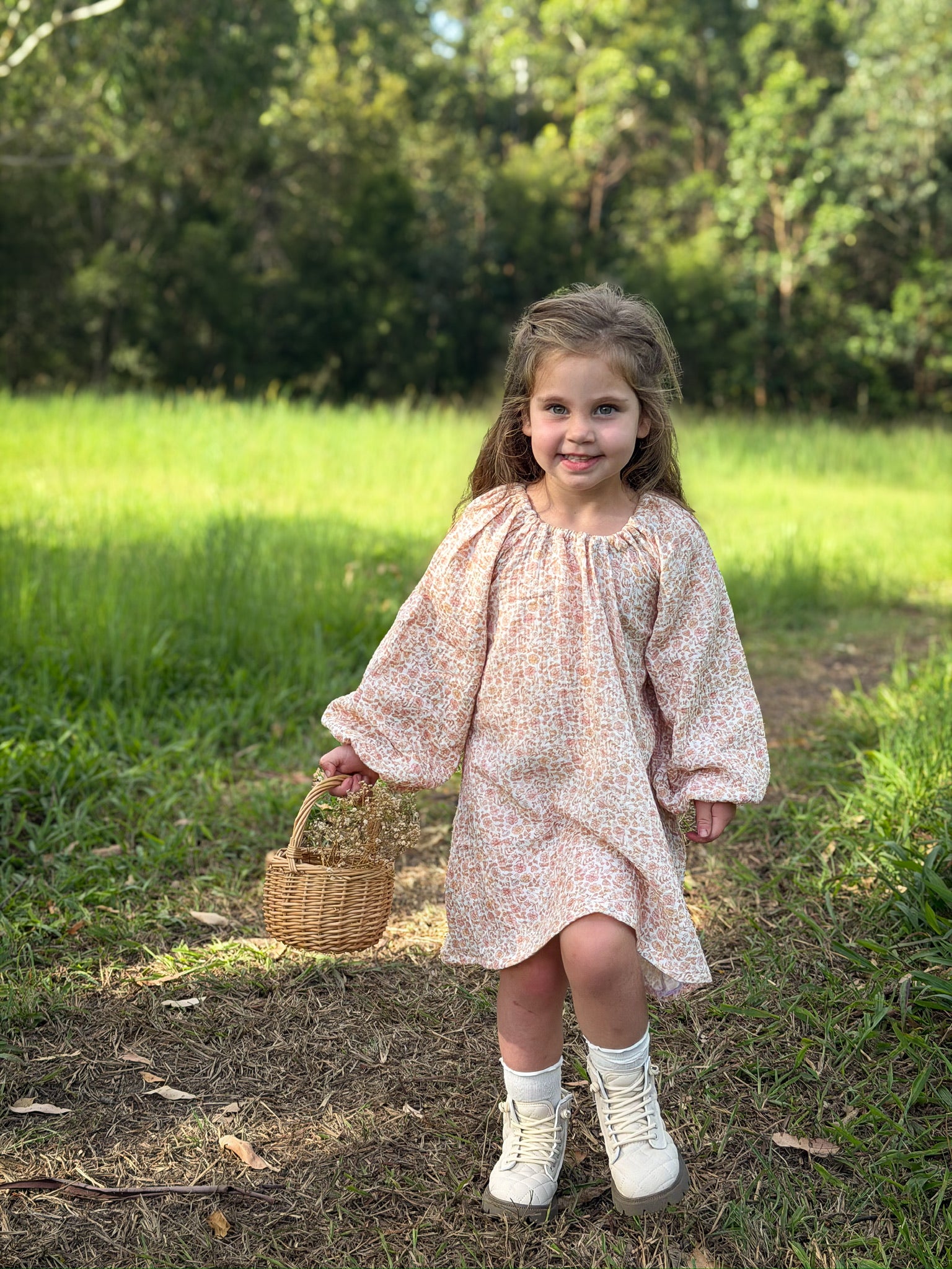 This new design features our classic smock dress style, with a gorgeous hem that curves upward at the centre and falls into soft side points. It is a very sweet piece that is sure to make your little one feel like a fairy.