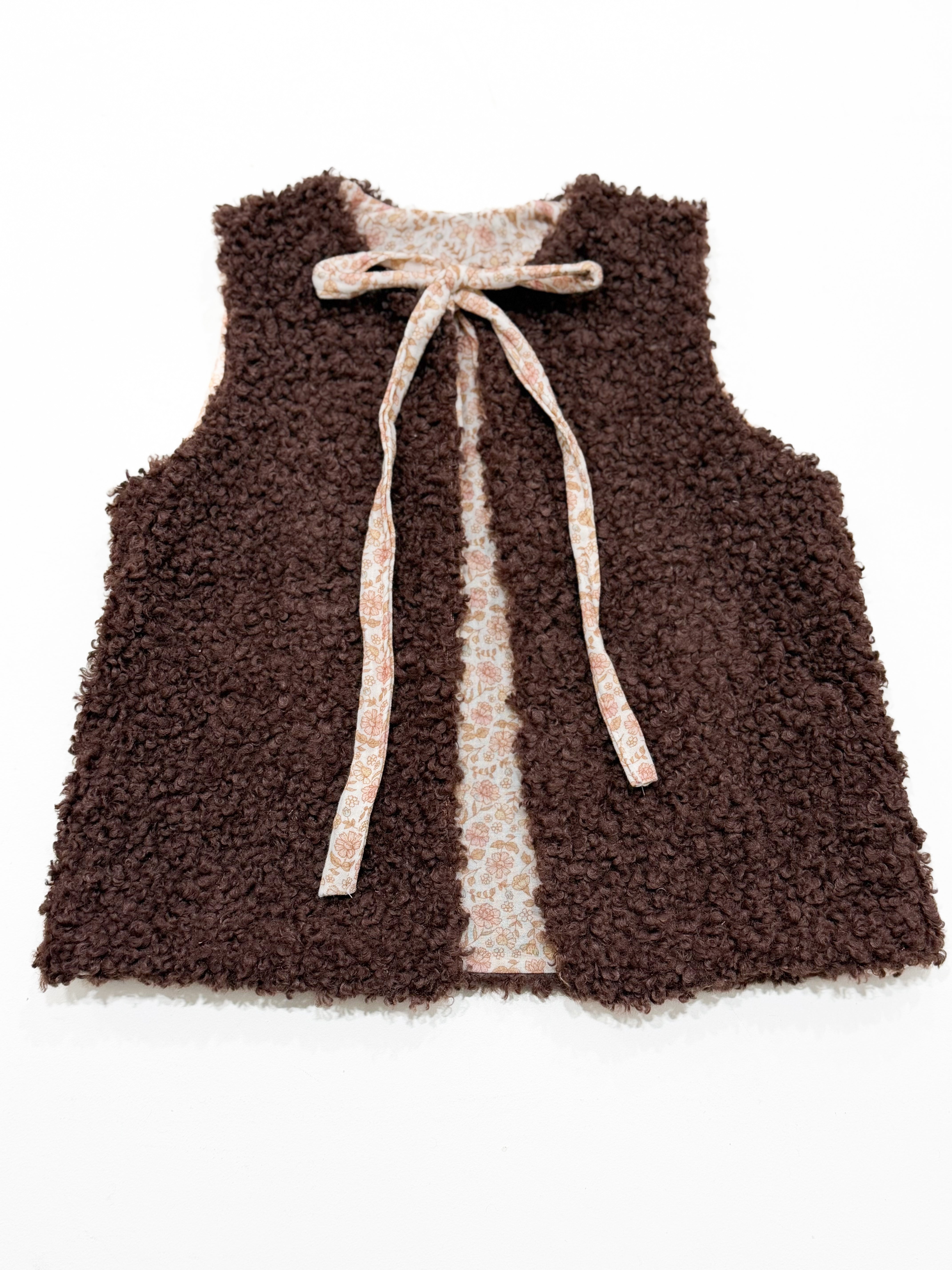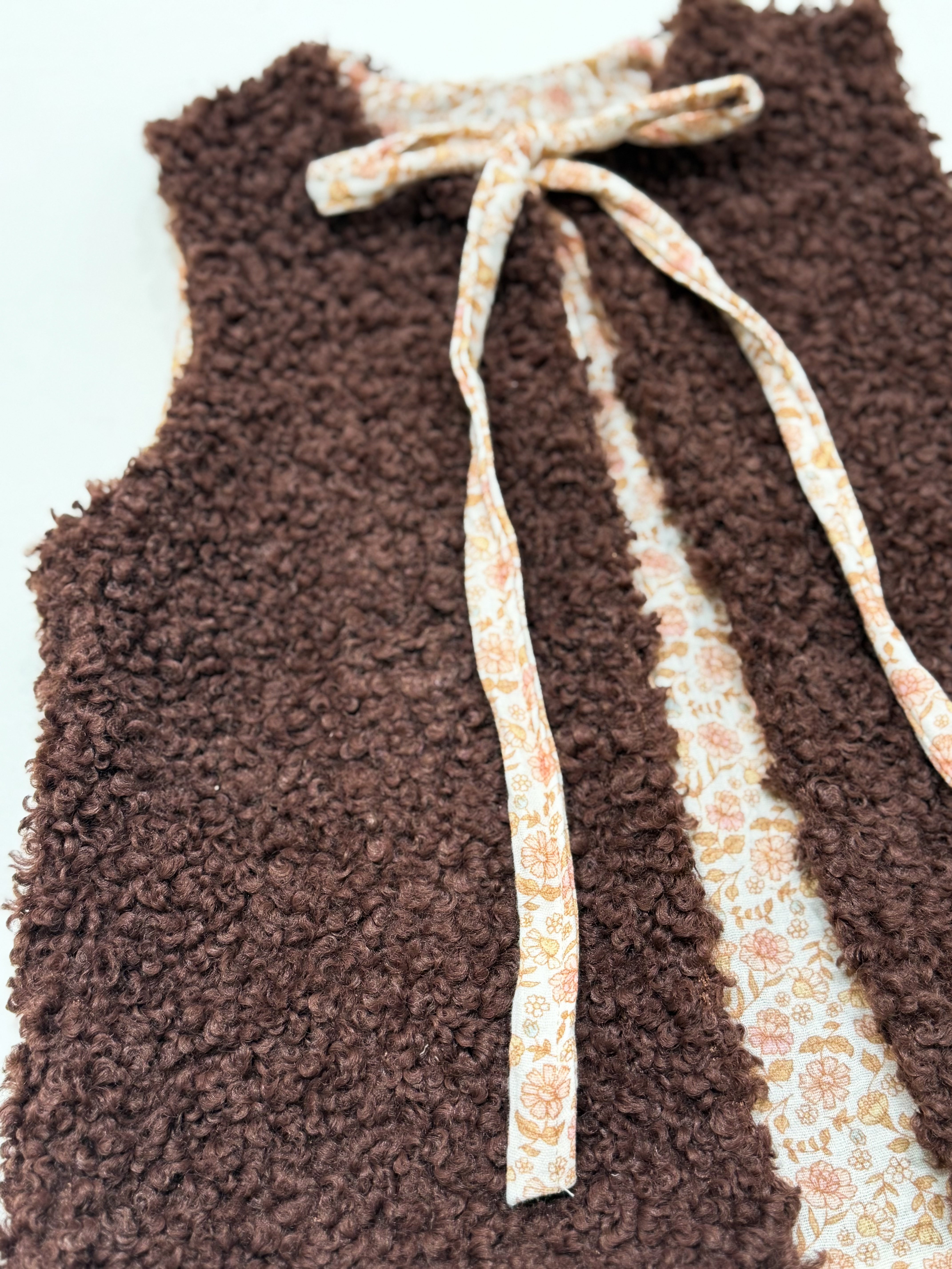 Introducing our Teddy Boucle Vest, a cozy layering essential for your little one during the colder seasons. Crafted with plush faux shearling on one side and Mendow floral muslin on the reverse, this vest is ideal for keeping them snug on brisk days. Adorable when paired with dresses or a T-shirt and leggings.
