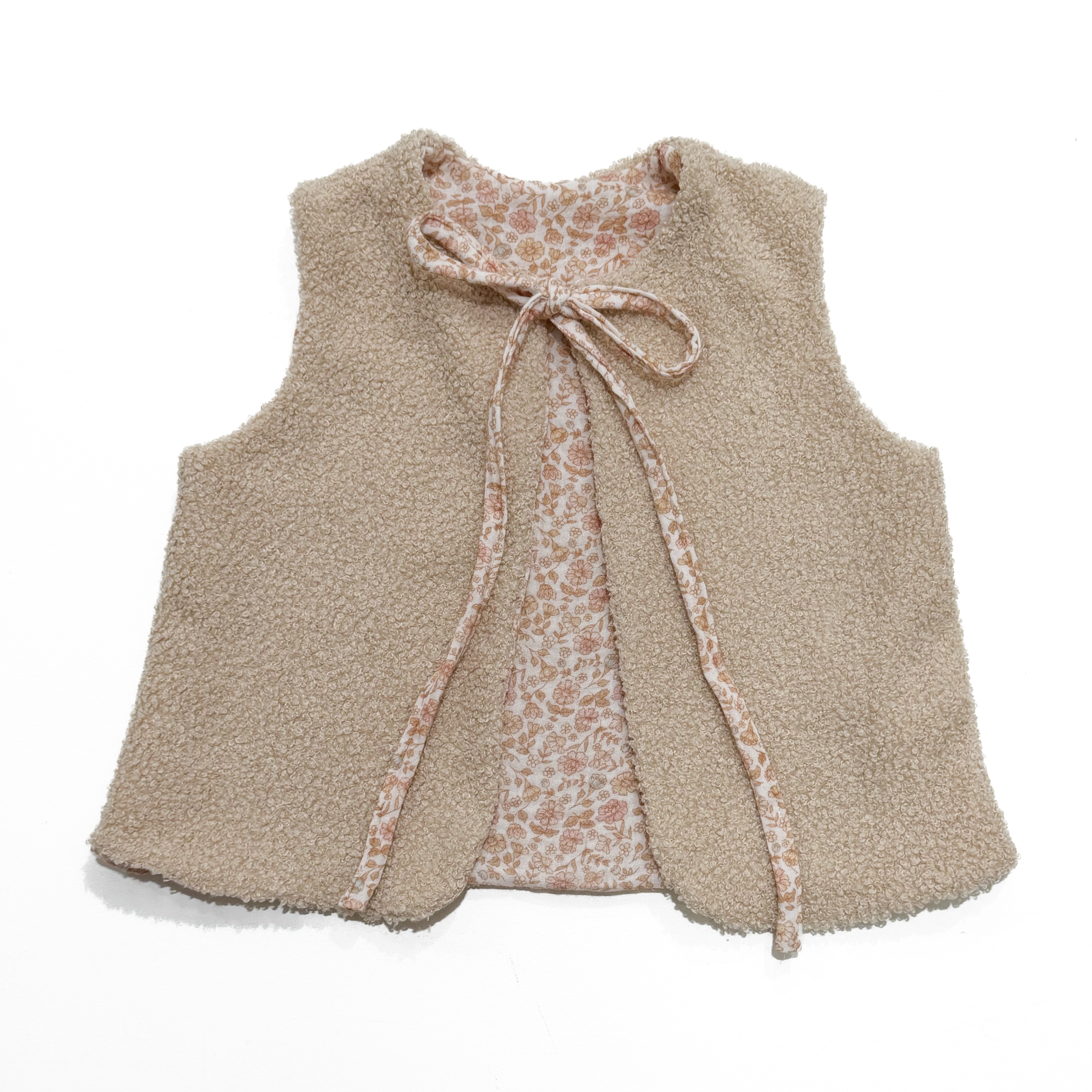 Introducing our Teddy Boucle Vest, a cozy layering essential for your little one during the colder seasons. Crafted with plush faux shearling on one side and Mendow floral muslin on the reverse, this vest is ideal for keeping them snug on brisk days. Adorable when paired with dresses or a T-shirt and leggings.