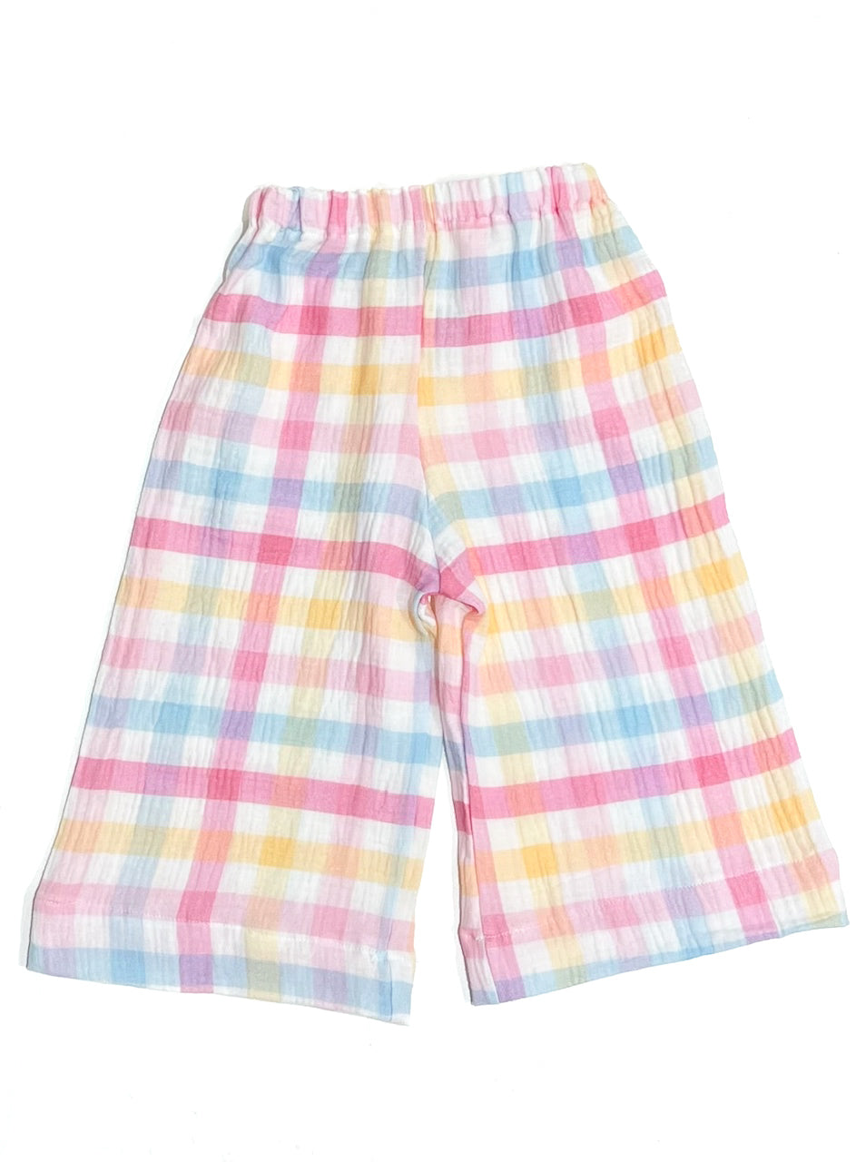 Our high waisted flow pants are made with a soft muslin fabric and feature an extra wide decorative ankle cuff for extra cuteness.