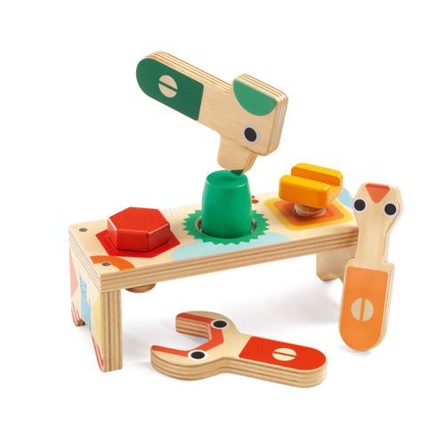 This adorable wooden tool set will keep toddlers entertained for hours. It features a colour little bench with 3 different screws in their colour coded place. It also comes with three animal-shaped tools. A dog hammer, a chicken screwdriver and a spanner. Each tool colour coded to the screws each tool helps get in place. A great toy to build fine motor skills, introduce colours and shapes with and discuss DIY activities.