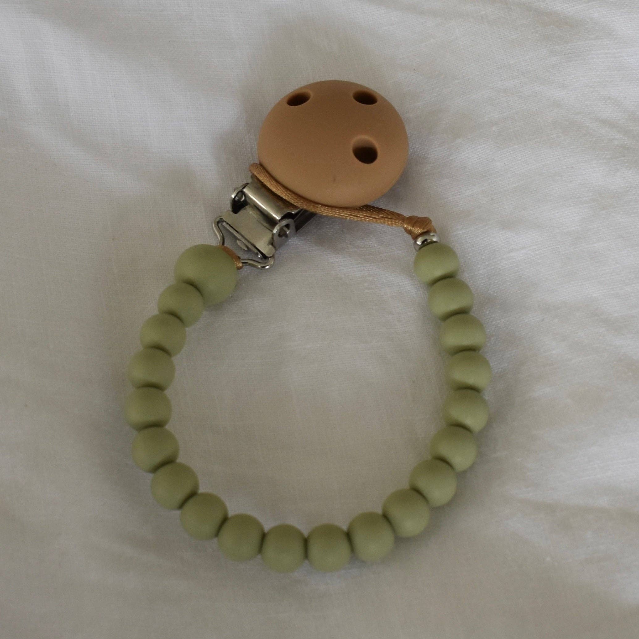 Made with silicone beads on a tough oatmeal coloured satin nylon cord, our Dummy Clips are perfect for drooly, grubby bubs - simply wipe with a damp, lint-free cloth or a baby wipe and you’re good to go! The end bead is a sturdy metal bead that ensures the silicone beads can’t be pulled over the knot (unlikely but as silicone beads are very stretchy, it could happen). Our design has been laboratory tested and certified so you can rest assured you are purchasing the best for your baby.